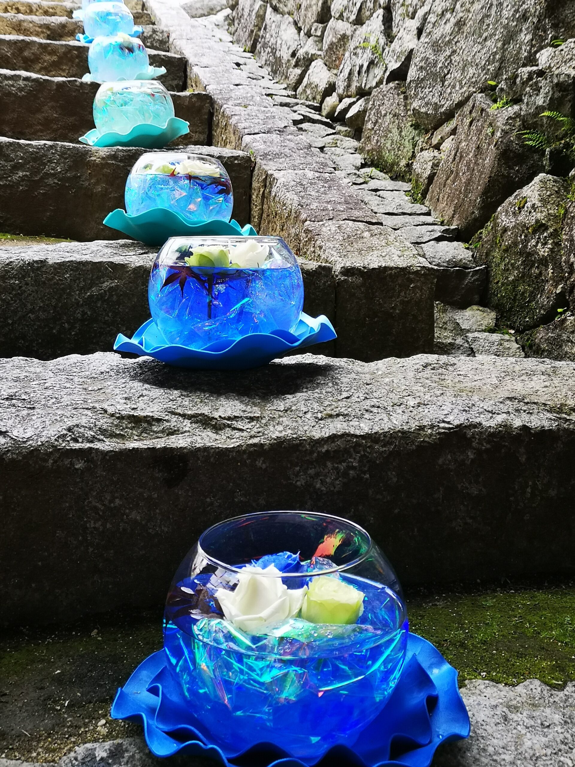 ガラスボウルフラワーが続く石段。それを上がると二之丸史跡庭園。流水園の花手水、フラワーベンチ、フラワーアーチに癒やされます。和傘のコラボも素敵です。運がよければ、演奏会やお茶席に参加することも。4月末~5月は、松山城庭園が新緑と花でいっぱいです。