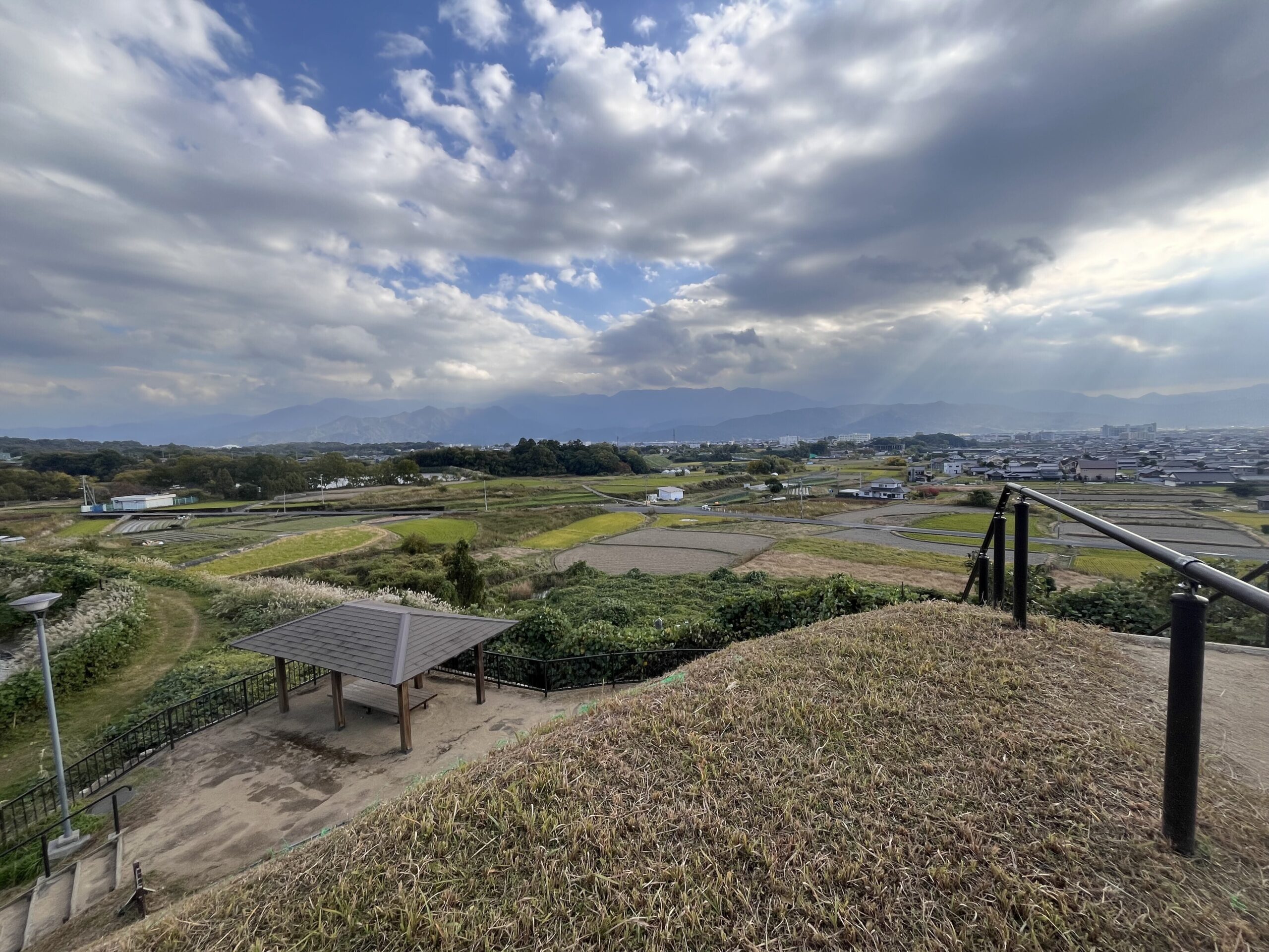果樹園から発見された国の史跡「葉佐池古墳」。頂上に登ると、遮るものもなく皿ヶ嶺連峰の山々が。