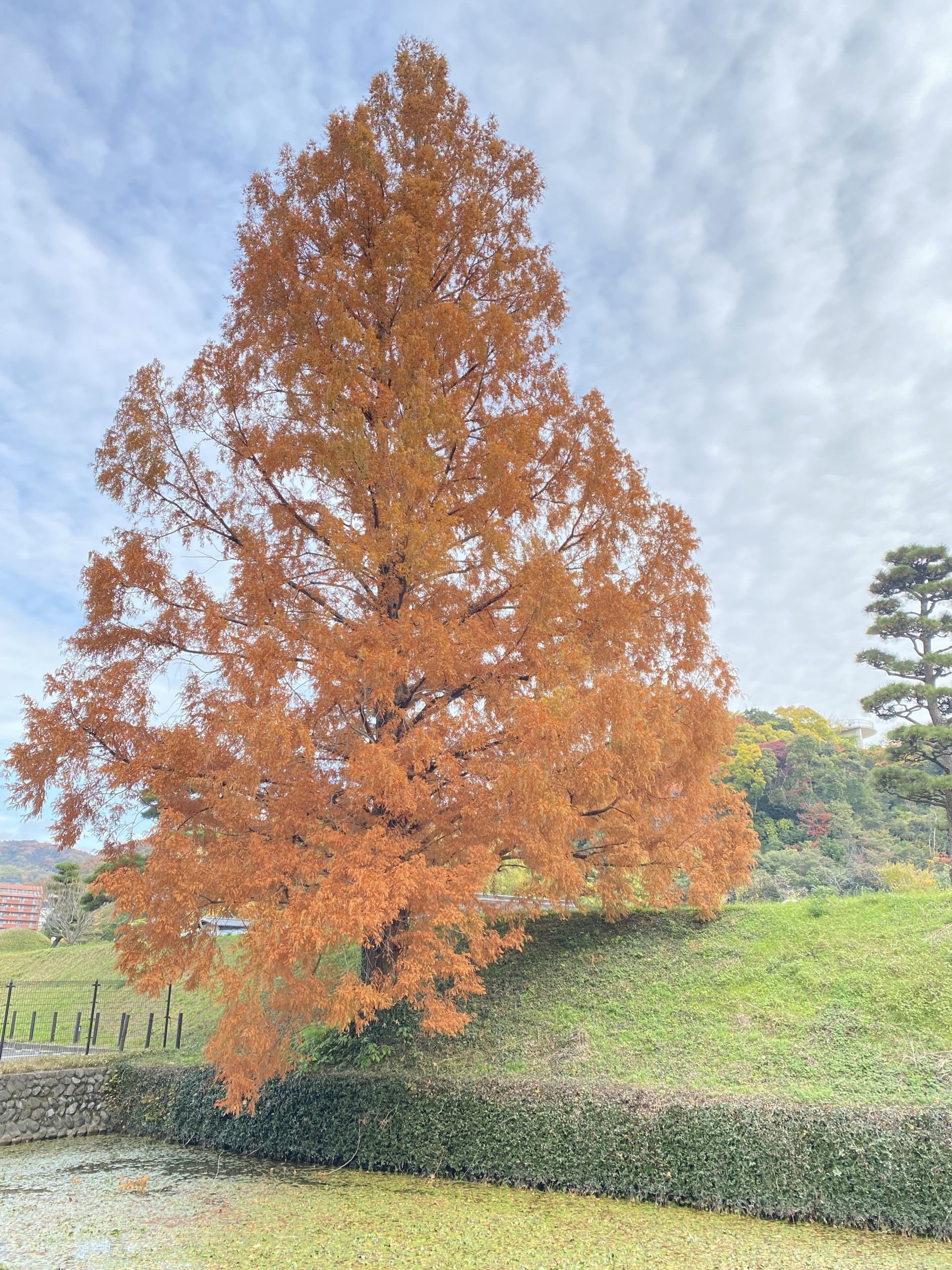 自宅近くにある道後公園の大きなメタセコイヤの木、通るたびに四季折々の美しい姿を見せてくれます。特に晩夏から秋へと移行する季節、雄大で美しく紅葉した姿が、大好きです。