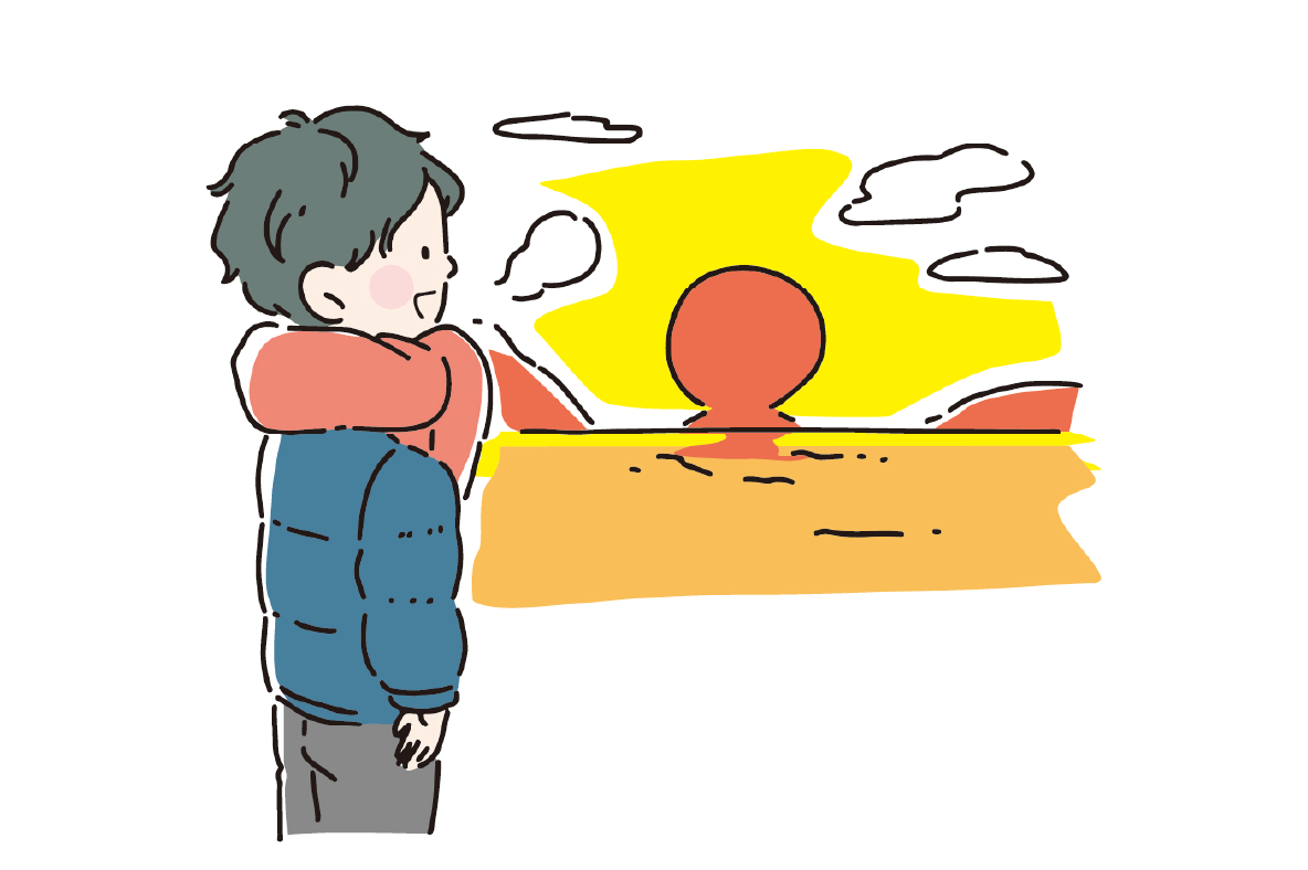 冬の海岸で見ただるま夕日が忘れられません。冷たい風の中、水平線に沈む太陽とその反射が海面に広がる光景は、本当に神秘的でした。あの瞬間、心が温かくなり、幸せを感じました。